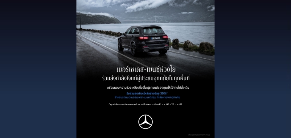 เพื่อบรรเทาภาระค่าใช้จ่ายในการดูแลรถยนต์ของท่าน เมอร์เซเดส-เบนซ์ ประเทศไทยขอมอบส่วนลดค่าอะไหล่อย่างน้อย 30%* สำหรับรถยนต์เมอร์เซเดส-เบนซ์ทุกรุ่น ที่เสียหายจากอุทกภัย