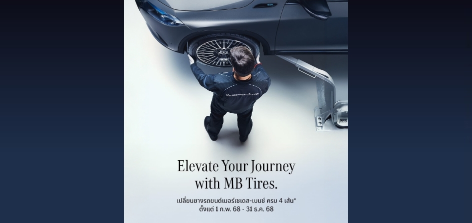 Elevate Your Journey with MB Tires ยางที่ออกแบบมาเฉพาะเมอร์เซเดส-เบนซ์ ช่วยเสริมสมรรถนะและความปลอดภัย พร้อมรับสิทธิพิเศษ เมื่อเข้ารับบริการเปลี่ยนยางรถยนต์เมอร์เซเดส-เบนซ์ จำนวน 4 เส้น